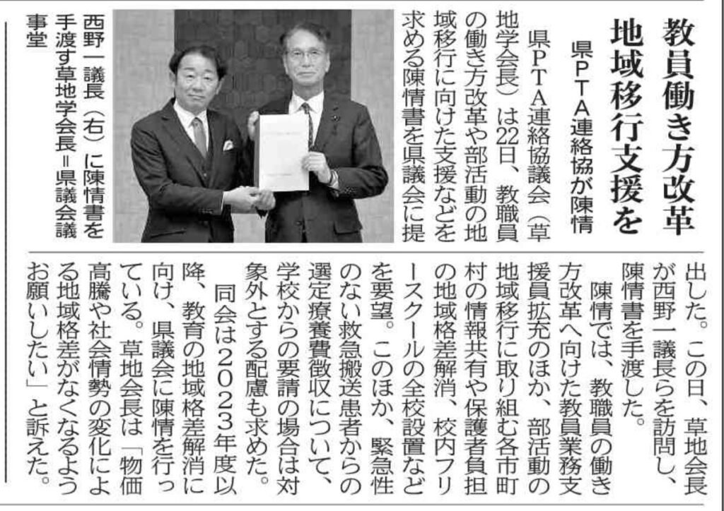 要望した内容は、総会で単P会長さんの声と県の理事会では市町村会長さんの声を頂き、総意として集めたものです。